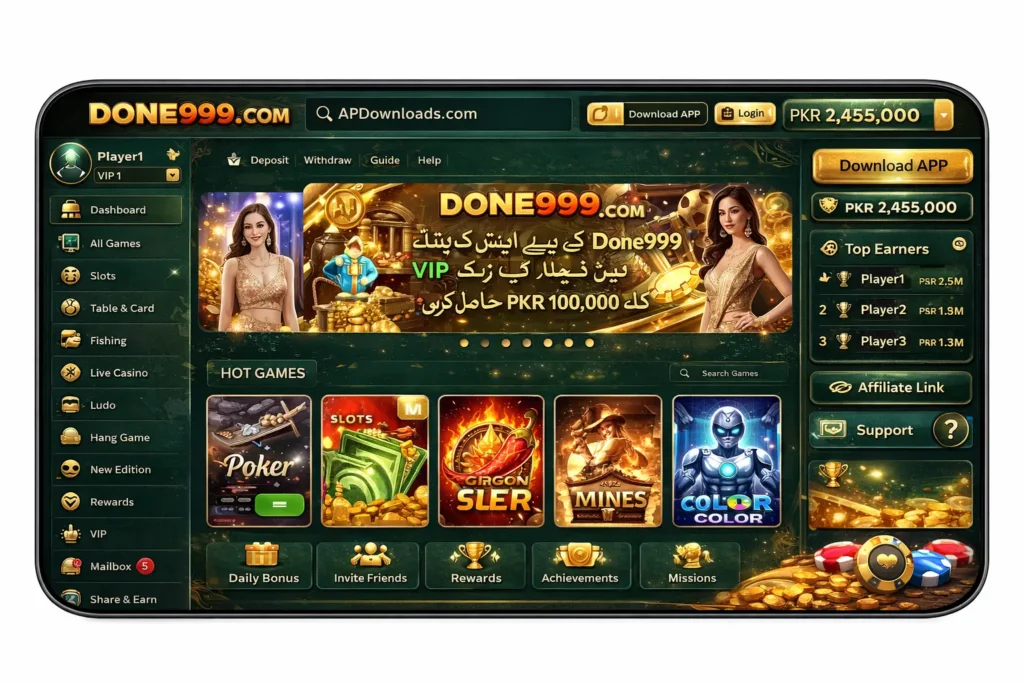 Done999 Game is a mobile app that many users explore for online entertainment. It offers a simple digital experience for Android users in Pakistan. First, the game library includes different types of games, such as casual games, reward based activities and chance based options, so users can choose according to their interests and enjoy variety instead of repeating the same activity. Moreover, the gaming platform offers bonuses like welcome rewards, daily login incentives and referral benefits which help users stay active and engaged on the app. In addition, the interface and graphics are designed to be user friendly, with a clean layout, easy navigation and simple buttons, so even new users can understand the system without confusion.